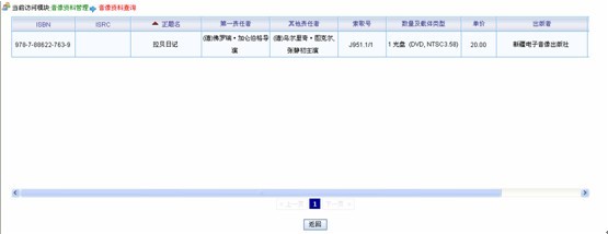 功能概述:通过ISBN号、正题名、分类号等多种途径查询、导出馆藏音像资料目录